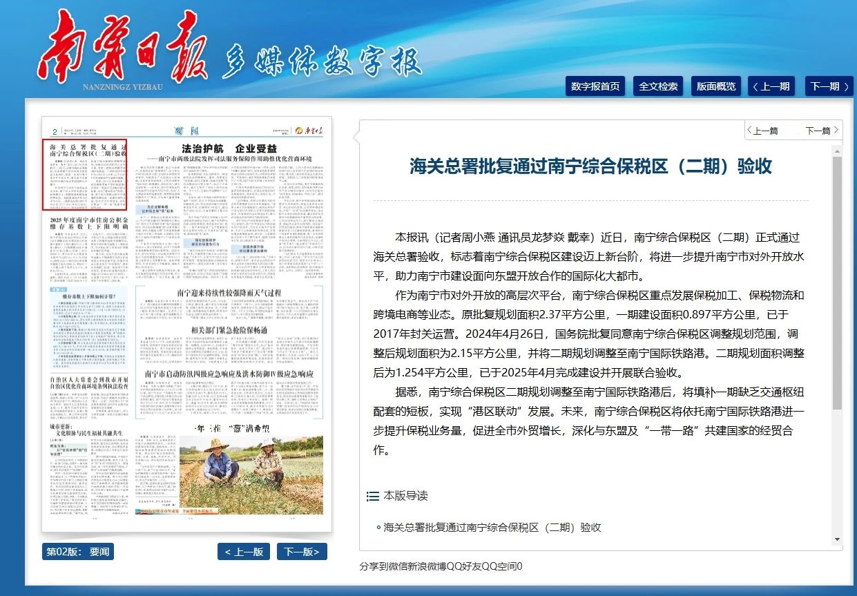 海關(guān)總署批復(fù)通過南寧綜合保稅區(qū)(二期)驗收